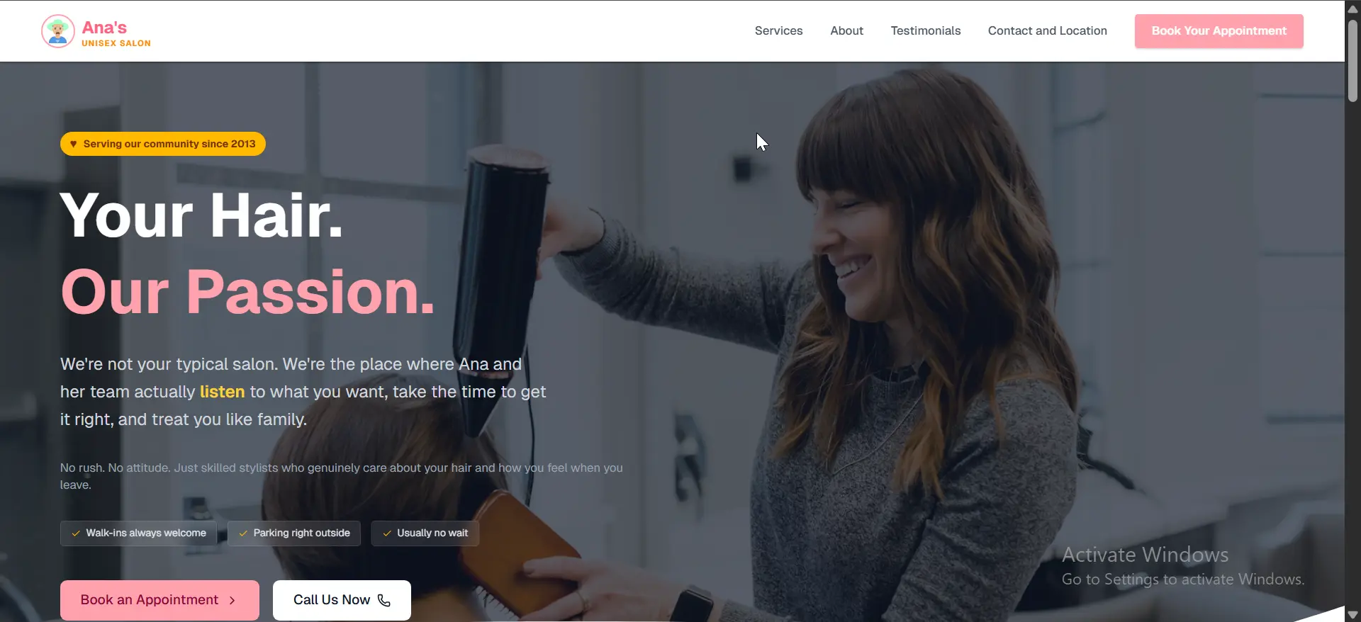 Modern salon website designed to attract bookings and showcase services beautifully.